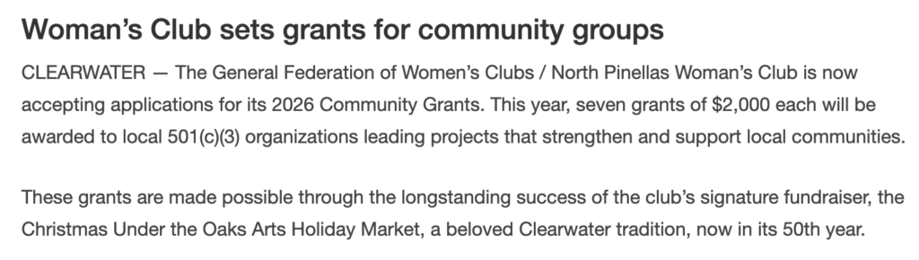 CLEARWATER — The General Federation of Women’s Clubs / North Pinellas Woman’s Club is now accepting applications for its 2026 Community Grants. This year, seven grants of $2,000 each will be awarded to local 501(c)(3) organizations leading projects that strengthen and support local communities.