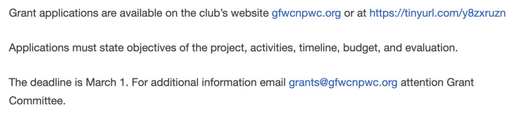 The deadline is March 1. For additional information email grants@gfwcnpwc.org attention Grant Committee.